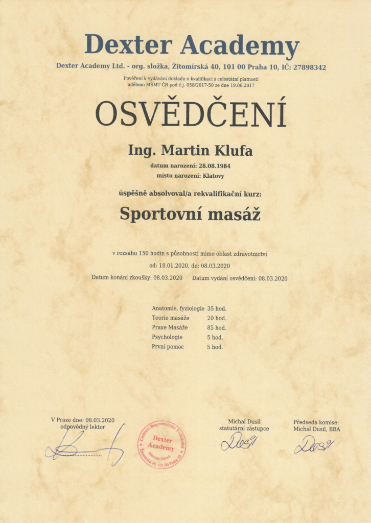 Toto poznání vyústilo na jaře roku 2020, kdy jsem úspěšně absolvoval rekvalifikační masérský kurz u Dexter Academy.